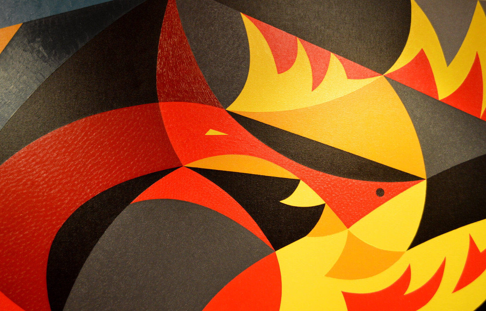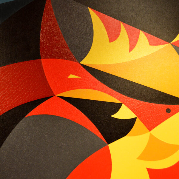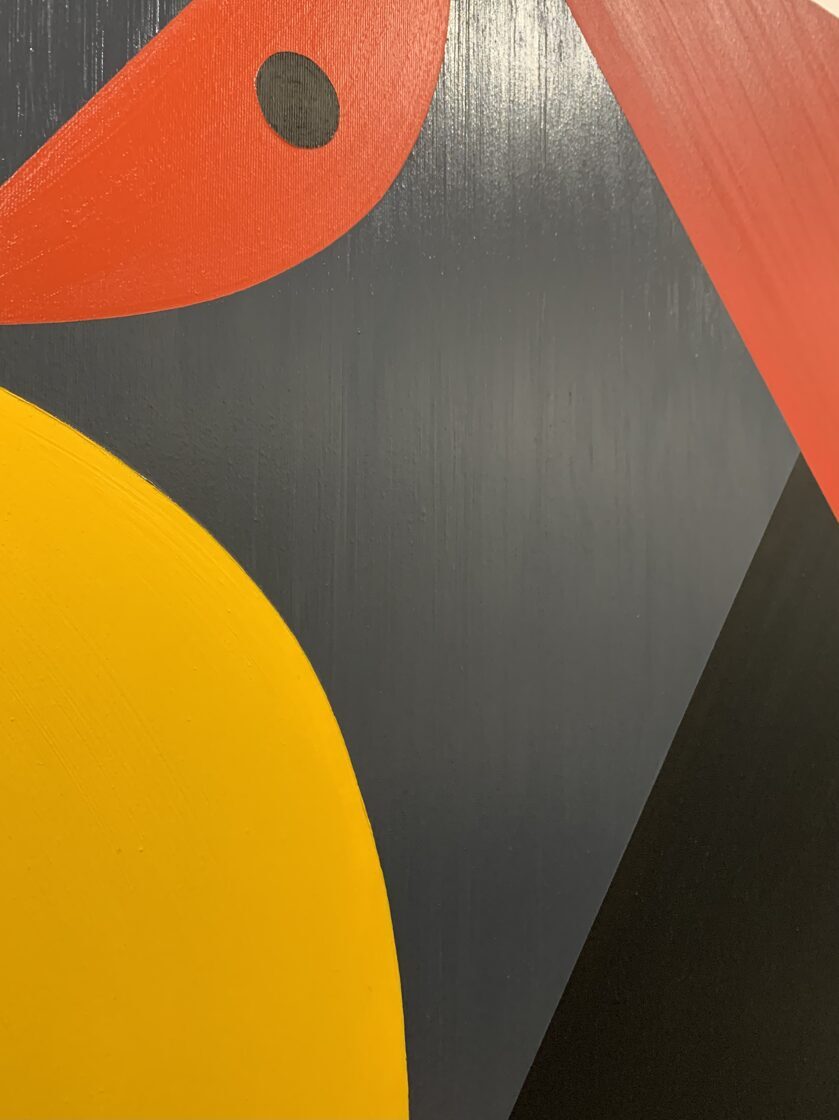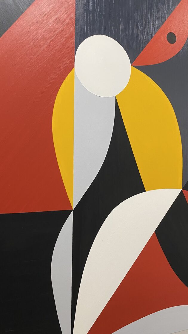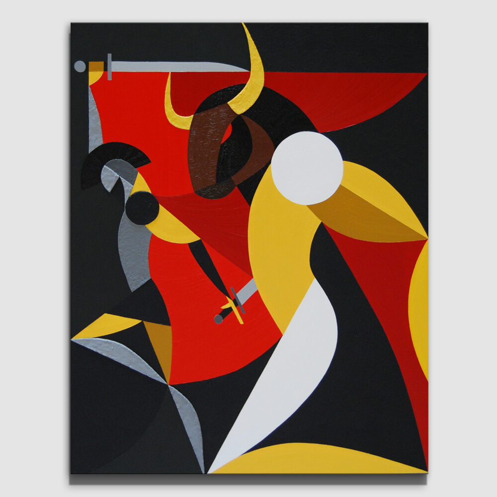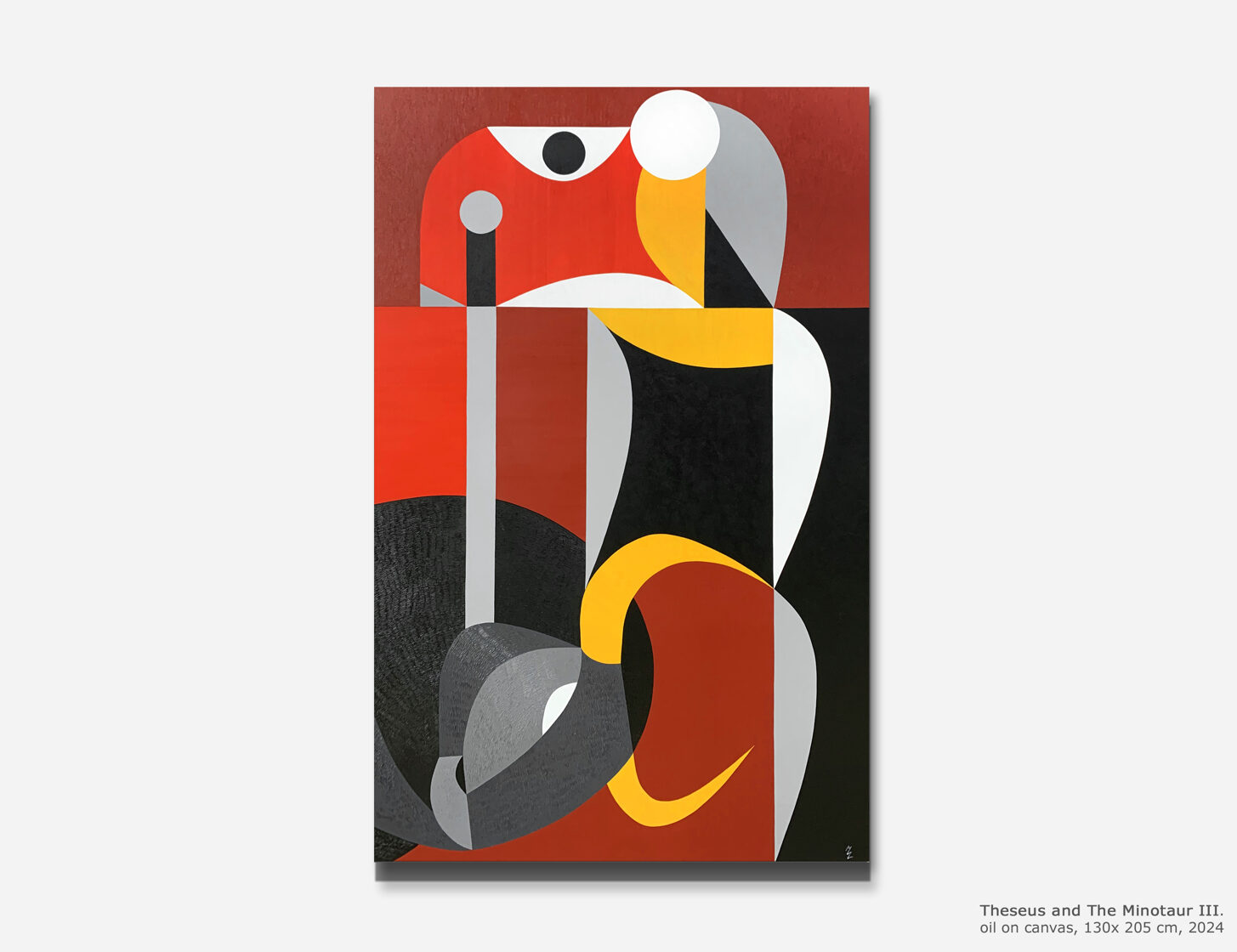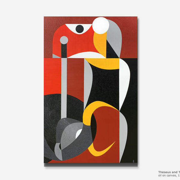 This painting depicts David’s victory over the colossus, though the well-known story is presented here in an unusual interpretation. In ancient myths, touching the forehead symbolized the awakening of deeper thought and the activation of the third, inner eye. In the painting, the small black circle on Goliath’s forehead represents the stone — appearing as a large, open red eye.In this reading, the struggle has no loser: whoever reaches the opening of the third eye through such an encounter is elevated to the level of the victor. Goliath, kneeling, has his head perfectly aligned with David’s — whose gesture no longer expresses aggression, but rather resembles that of a king knighting the one who kneels before him.