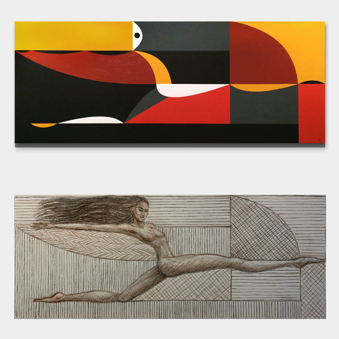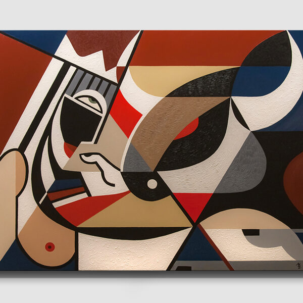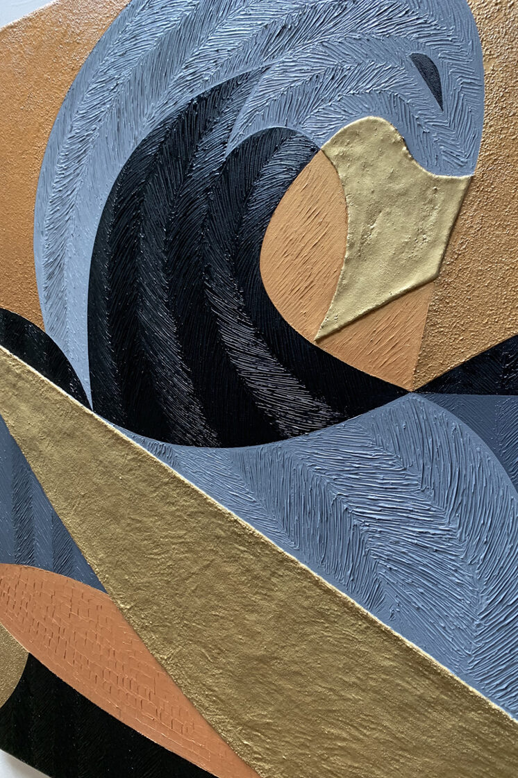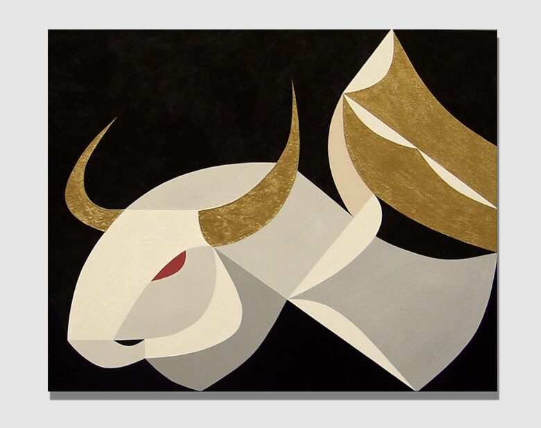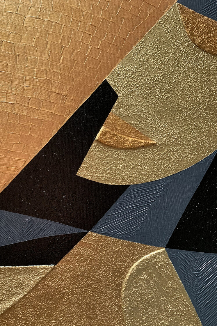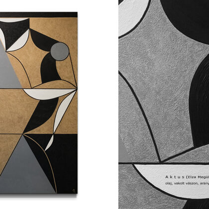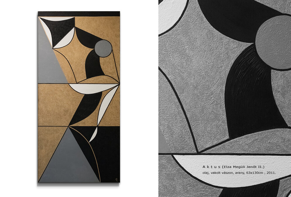 Emese’s Dream is one of the foundational images of the Hungarian origin myth: the turul bird, also known as the peregrine falcon, appears to the sleeping Emese as a divine symbol and spiritually fertilizes her. The child born from this vision is Álmos (meaning “sleepy” in Hungarian), who is thus partly descended from a celestial father. Several elements of this mythological story parallel the Egyptian legend of Horus, the falcon-headed god, who was born to Isisthrough magic, after her husband Osiris was killed by Set. Later, in the Christian tradition, the story of the Virgin Mary, where Christ’s divine origin is linked to the visitation of the Holy Spirit—often depicted in the form of a dove—also bears strong similarities. Moreover, some Hungarian historians and etymologists trace the word "karácsony"(Christmas) back to "kerecsen" (falcon). The period around the winter solstice, December 21–25, carried the same meaning in Egyptian, Christian, and ancient Hungarian belief systems alike: the triumph of light over darkness. Emese’s Dream is therefore both a national origin myth and a universal archetype: a mother, who under the influence of a spiritual force, gives birth to a son who brings a new era to his people. This image seeks to connect the layers of the Hungarian myth with the great religious and mythological traditions of the world through its visual language, in which the formal elements of Egyptian, Scythian, and early Christian mosaics can be recognized. The use of gold in the painting symbolizes the timeless representation of the supernatural found in many ancient cultures. As with all of my geometric compositions, this piece too was created in a stylized yet modernized language reminiscent of the visual traditions of ancient civilizations. Emese is depicted lying down, propped up on one elbow, eyes closed, embraced by a black-painted turul in the background.