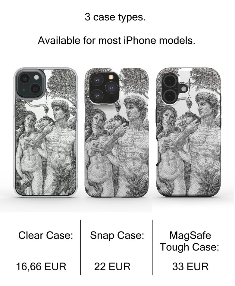 This work was inspired by the iPhone logo. According to the concept, the apple depicted here is the same one that appears in the Bible. Just as we accepted the apple in the Garden of Eden in pursuit of divine knowledge — and with it, fell into earthly existence — today we follow the same symbol as we enter virtual existence. Botticelli’s Venus (1485–86) as Eve and Michelangelo’s David (1501–04) as Adam. Both masterpieces were created in Florence and represent the two main sources of European cultural history: the Greco-Roman and the Judeo-Christian. The Western relationship to science, the supernatural, and the individual was born out of the fusion of these two worlds. The Renaissance brought the rediscovery of antique knowledge and placed the individual alongside the collective. The artwork printed on this case is a high-resolution scan of an original, hand-drawn ink illustration. The detailed line work is preserved through museum-quality digital processing and precision printing, ensuring the final result remains faithful to the original.